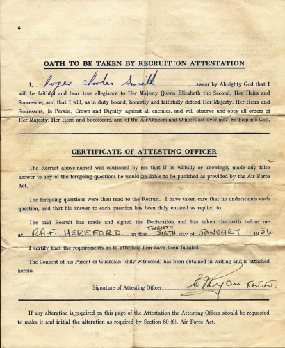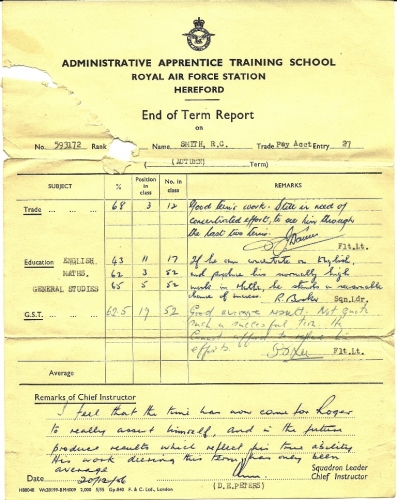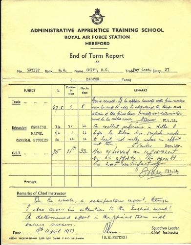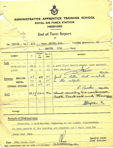 The TWENTY SEVENTH Entry was attested at the Administrative Apprentice Training School RAF Hereford on 26 January 1956.Training was undertaken there in the trades of Clerk Secretarial, Pay Accounting and Supply until 1 August 1957.