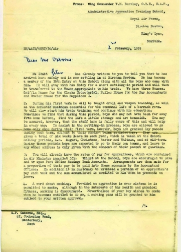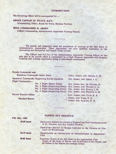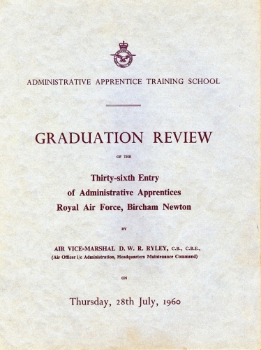 The THIRTY SIXTH Entry was attested at the Administrative Apprentice Training School RAF Bircham Newton in January 1959.Training was undertaken there in the trades of Pay Accounting, Clerk Secretarial and Supply until 28 July 1960.