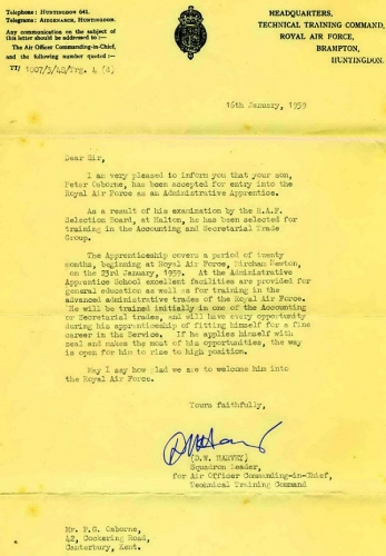 I first met Peter in early January 1959, on a very cold and windy railway platform in Kings Lynn whilst waiting for a connecting train to Heacham where we were to be met by Corporal Jimmie Stewart and transferred to the AATS at RAF Bircham Newton. During that first meeting, whilst enjoying a sneaky cigarette, we discovered that we shared the same birthday and that he was two hours older than me. Thereafter, we exchanged birthday cards each year until we lost touch.