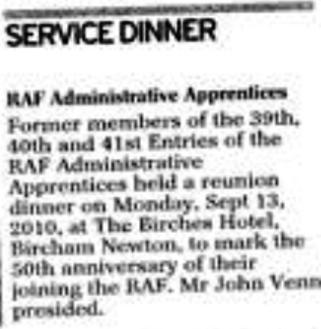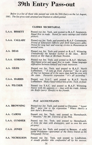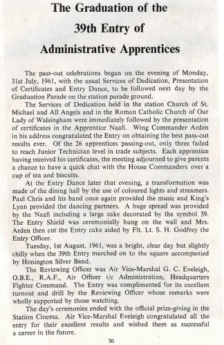 The THIRTY NINTH Entry was attested at the Administrative Apprentice Training School RAF Bircham Newton in January 1960.Training was undertaken there in the trades of Pay Accounting, Clerk Secretarial and Supply at until 1 August 1961.