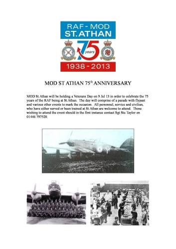 MOD St Athan will be holding a Veterans Day on 9 Jul 13 in order to celebrate the 75 years of the RAF being at St Athan. The day will comprise of a parade with flypast and various other events to mark the occasion. All personnel, service and civilian, who have either served or been trained at St Athan are welcome to attend. Those wishing to attend the event should in the first instance contact Sgt Stu Taylor on 01446 797520.